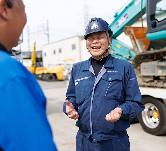 運送課のミッションは、現場で使用する重機や資材を安全かつ確実に運搬することです。運搬するエリアは近畿圏内が中心で、現場作業が滞りなく進むように運搬の段取りや時間を守ることを徹底しています。また、単に運搬するだけではないのが、大型ドライバーの魅力。職人さんたちとコミュニケーションを取り、安全かつ現場の作業にすぐ取り掛かれるような最適な場所に重機を積み下ろす必要があります。とは言え、ユンボなど大型の機材を運搬することが多いため、細心の注意が必要です。緊張感を持って指差し確認や声かけなどの基本は徹底しつつ、想定の位置よりも、現場の作業がしやすい位置に積み下ろせたときは、達成感がありますね。職人さんから「ありがとう」と感謝の言葉をもらうことも多く、そういった瞬間がやりがいに繋がります。